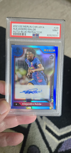 Lastly from the soccer world are two more cards I picked up a couple of months ago. I wanted to get in on the Bradley Barcola hype so bought a Topps Merlin rookie auto /199 from my local card shop. That same trip I also bought a Topps Chrome Euros 2024hobby box. My auto ended up being just mid, in Belgian Leandro Trossard. It was not nearly as good of a box as my son got during Christmas time when he pulled two numbered autos, including a Xavi /10.